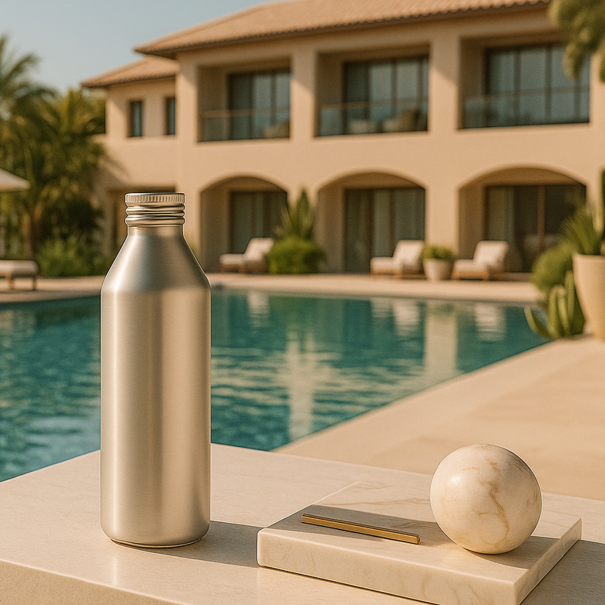 Every touchpoint shapes a client's perception. Custom aluminum water transforms a simple amenity into a refined, memorable experience that aligns with the standards of world-class hospitality.